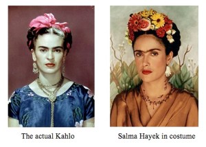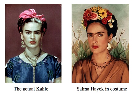 In biographical films, costume is an important aspect of making an actor resemble a historical character. For example, in Frida, the actress Salma Hayek was not only dressed in Mexican garb contemporaneous with the 1940’s, she is also given a fake unibrow to more closely resemble the painter Frida Kahlo.