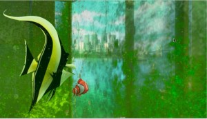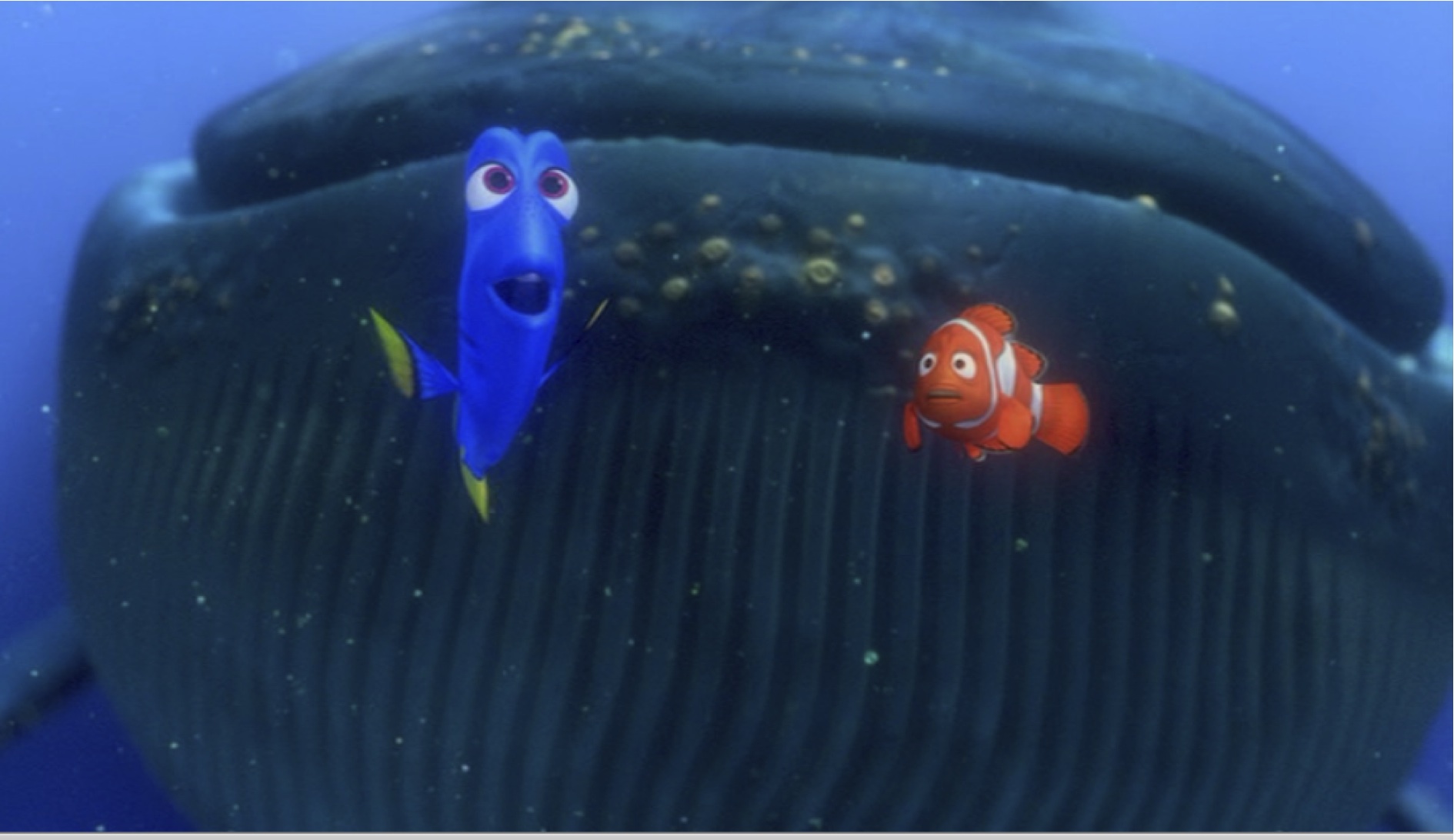 The opposite of deep space is shallow space. In shallow space, the image appears flat or two dimensional, because there is little or no depth. In this image from Finding Nemo, the whale is approaching Dory and Marlin from behind, which creates suspense for the viewer, because the fish are unaware of the whale’s presence. There is a loss of realism, but it enhances the viewing by emphasizing the close proximity of the whale to Dory and Marlin and creating concern in the viewers that they may soon be eaten.