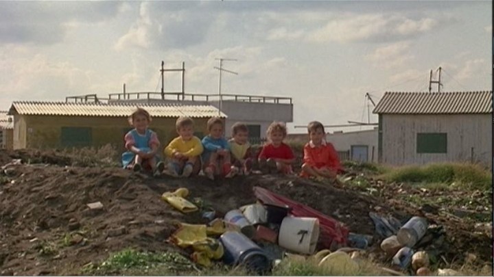 The next shot, from Pier Paolo Pasolini’s The Earth Seen From the Moon [La terra vista dalla luna, 1966], provides a good example of the many and various effects that can be achieved via mise-en-scène. Although the film was shot on-location, the director’s style is not altogether realist. While he wishes to depict a shanty town in the suburbs of Rome, the colorful rubble and freshly painted buildings underscore his playful, ironic approach to the subject matter. The vibrantly clad children have no active role in the film and, since Pasolini means to criticize romanticized visions of Italian poverty, they are to be seen as location details.