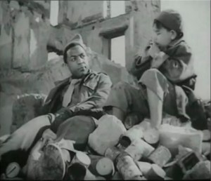 In the Naples episode, the plot is simple. The child and the soldier play, and then the child steals the soldier’s shoes. Upon finding the child later, the soldier makes the child take him back to his mother and father to be disciplined. The child leads the soldier into a dark cave where women of all ages, dirt-poor, emerge from the shadows to greet him. It becomes clear that their husbands were killed by war. They bring out children, both their own and the orphans they take care of, and offer the soldier food and kindness; both of which are in short supply. Here again we see the fundamental goodness and innocence of people struggling against the corruption of innocence, a situation that compels the audience to step in and take action. Italy was portrayed in these films as a land full of these innocent characters – these children and people like children struggling against the outside world.